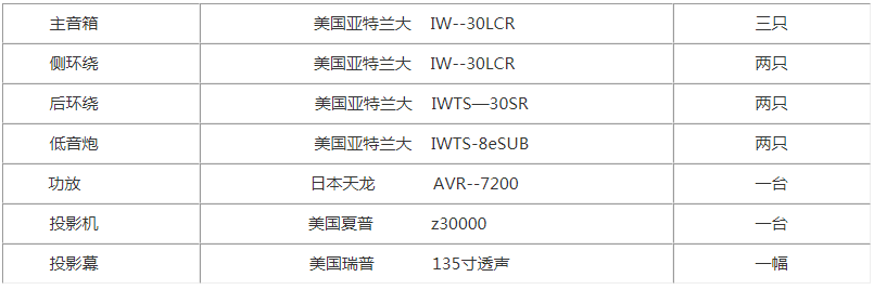 音箱器材全部選用了美國頂級的家庭影院音箱品牌亞特蘭大,從30年前建廠伊始,該廠自我要求標準是要「重現真實」,并特別強調的有四大要素,包括(一)清晰的對話與音效(二)橫跨整個銀幕及各個方向的精準定位與移動(三)有說服力的逼真包圍感(四)強勁快速又結實飽滿的低頻能量。使用該品牌作為家庭影院音箱,實乃享受頂級影音效果的無他首選。與之匹配的DENON功放也是功放產品界頂尖品牌,無論從整體設計到細小環節,無處不為用戶得到最佳體驗考慮到極致,合并式功放的搭配也可以輕松實現坐擁時下最頂尖杜比7.1聲道解碼,并且調校方便,操作簡易,對擴聲方面的要求做到一步到位。