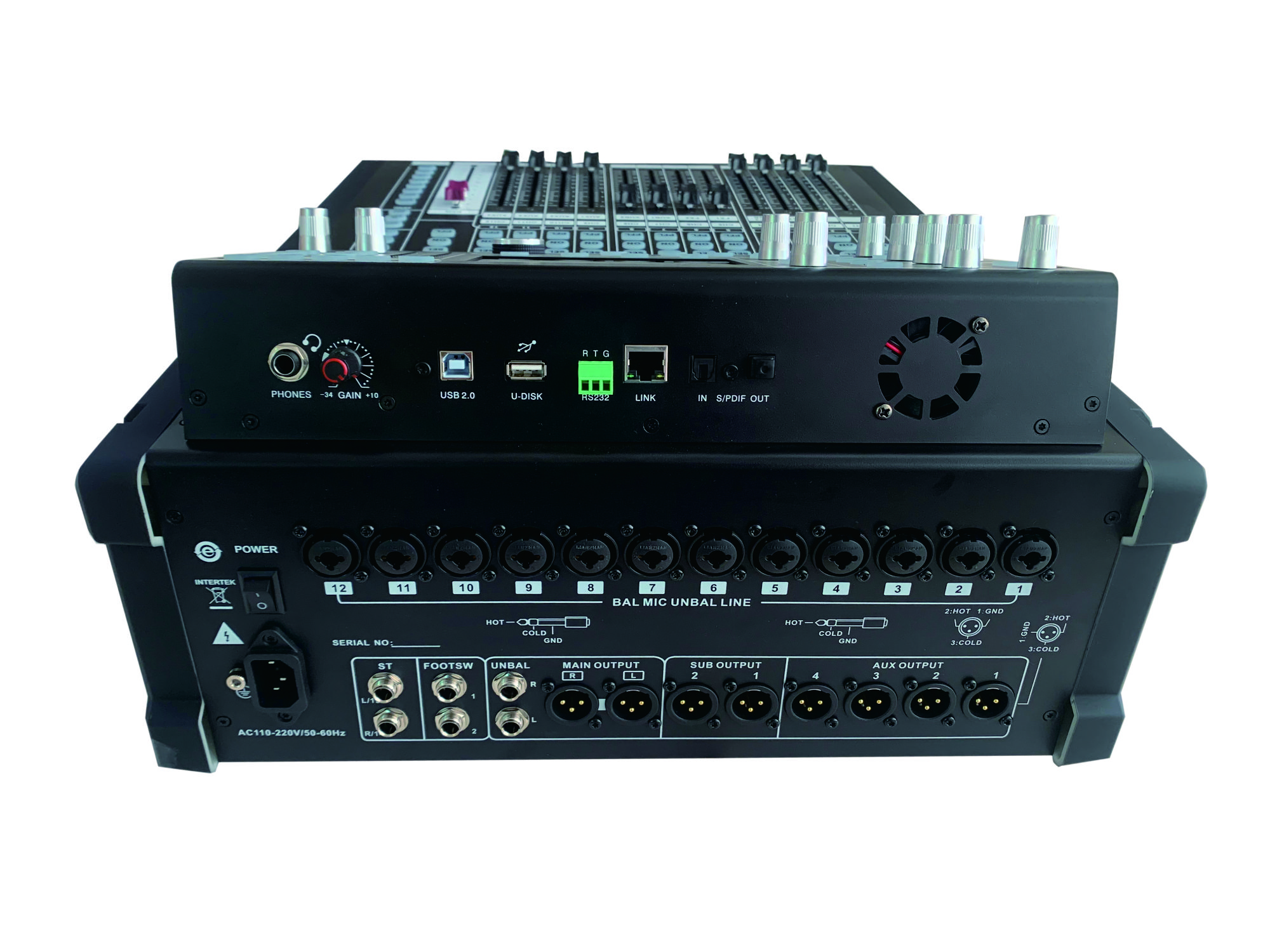•・12路MIC輸入1組立體聲輸入,1路數字輸入:光纖/聲卡,MP3